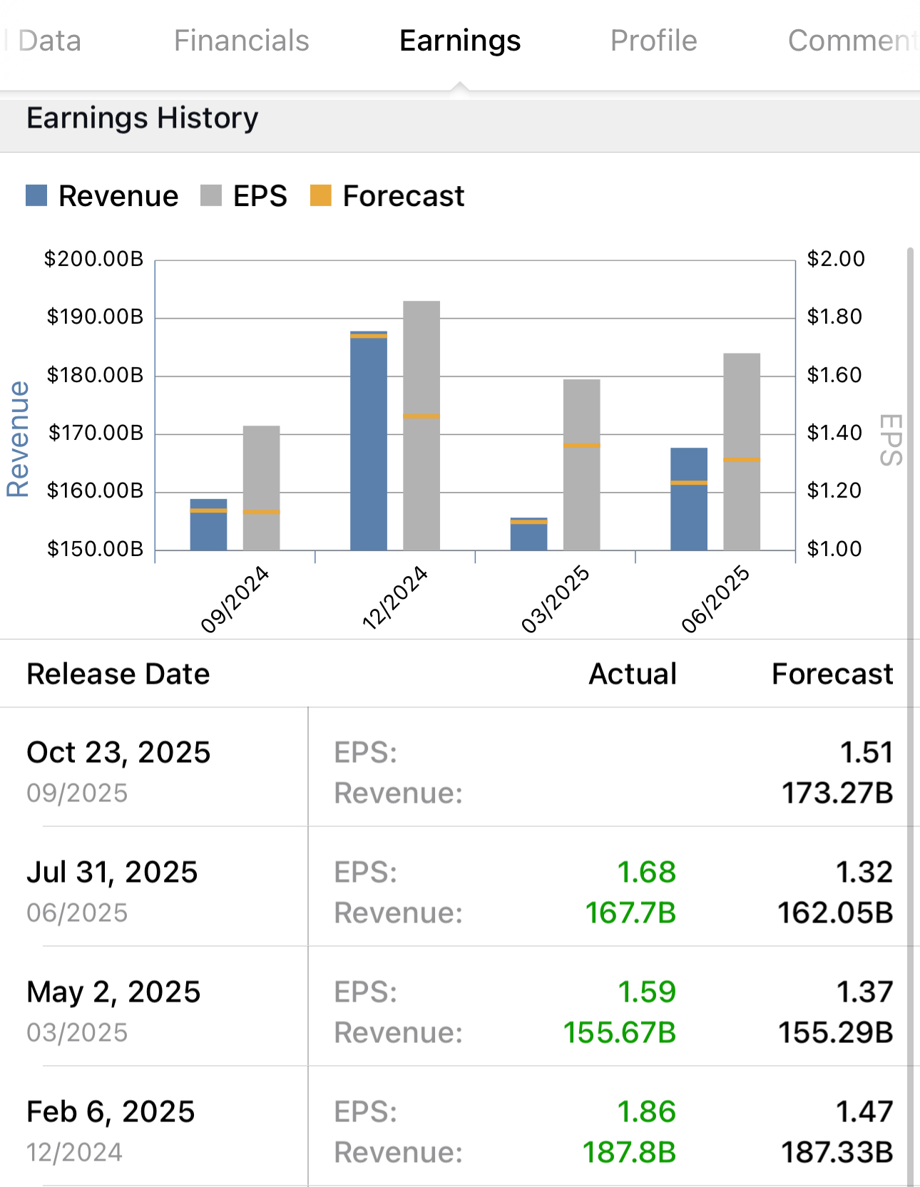 분기 매출 1677억 달러에 주당 순이익 1.68불입니다. 애널리스 예상보다는 모두 좋게 나왔습니다.