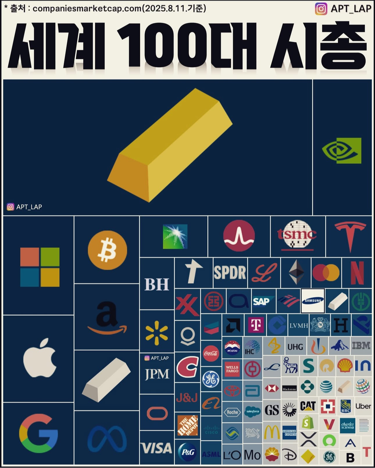 이상으로 오늘 글은 이만 마치며, 마무리짤로는 세계100대 시총입니다. 금이 작년 하반기 부터 엄청 오르더니 1등입니다. 엔비디아 더 분발해야겠네요. 우리나라 기업들중 삼성이 숨어 있습니다.