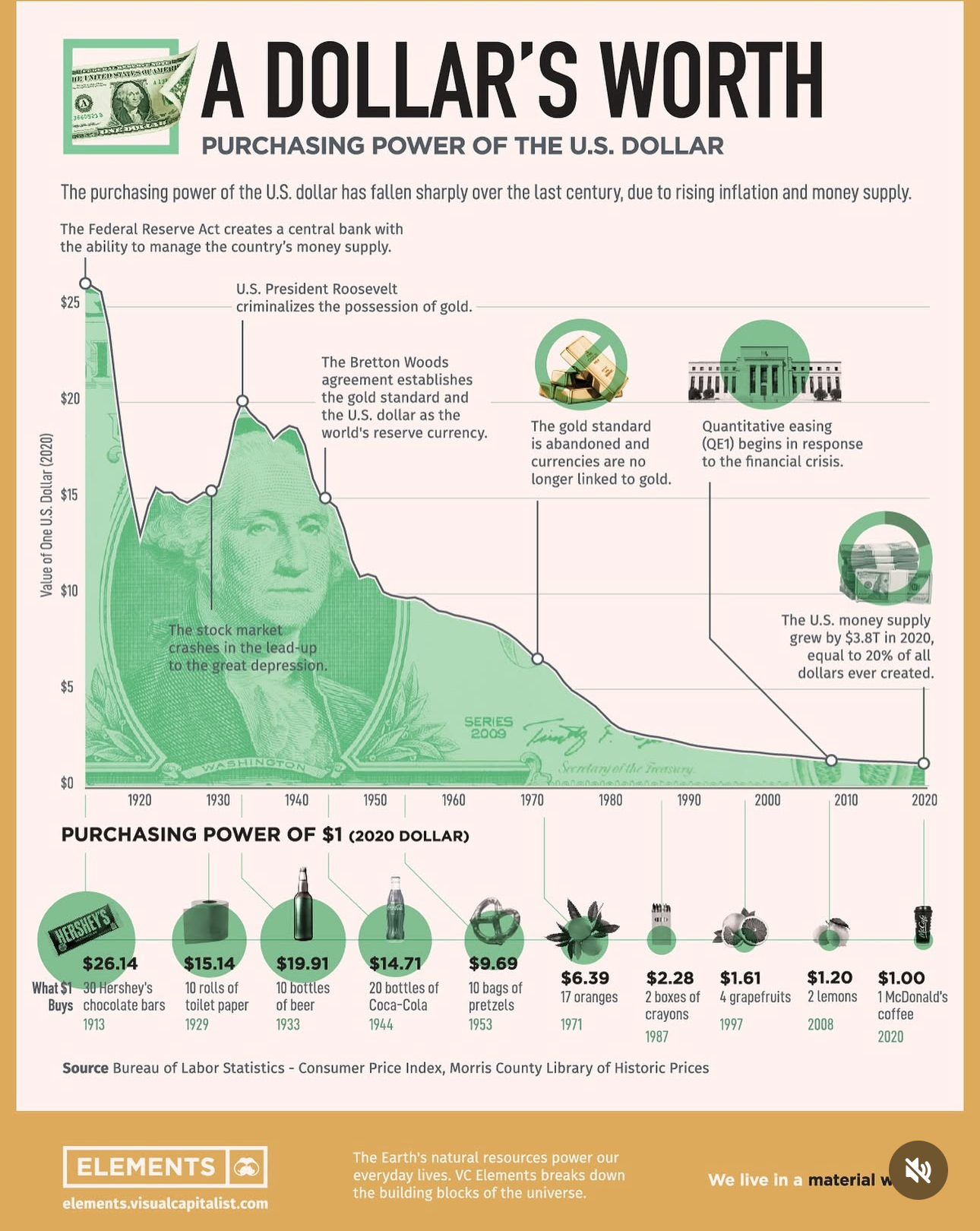 이상으로 오늘 글은 이만 마치며, 마무리짤로는 역사적으로 1달러의 가치 입니다. 1913년도에는 1달러로 30개의 허쉬 초콜릿을 살수 있었으나, 2020년에는 맥도널드에서 커피 한잔 가격입니다.