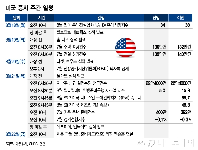 오늘은 3일 연휴이후 출근 하는 월요일이여서 이번주 미국 증시 주간 일정 정보를 공유합니다. 이번주 수요일 연준의 7월 회의록 공개 예정일, 목요일 월마트 실적 발표 예정일 및 금요일에 제롬 파월 연준 의장의 잭슨홀 스피치가 예정 되어 있습니다.