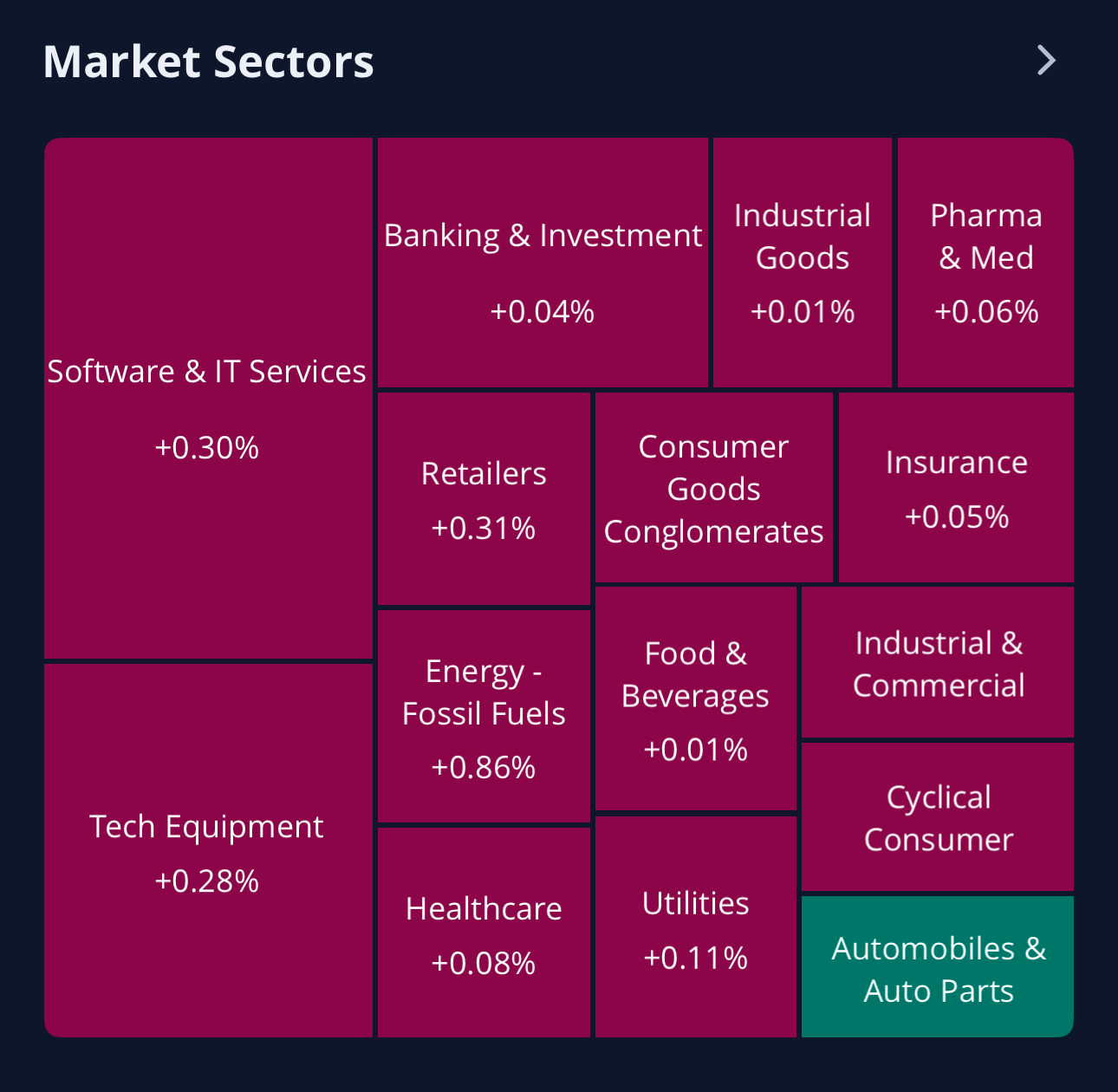 전체 섹터들중 자동차 섹터를 제외 하고 모두 상승 입니다.