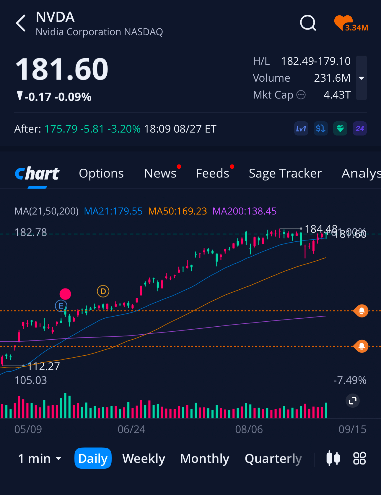 오늘의 특징주 종목은 엔비디아입니다. 모든 투자자들이 기다려온 2분기 실적을 발표 했습니다. 실적은 애널 예상 보다 좋게 나왔지만 시간외마켓에서 -2.4% 빠지는 중입니다.