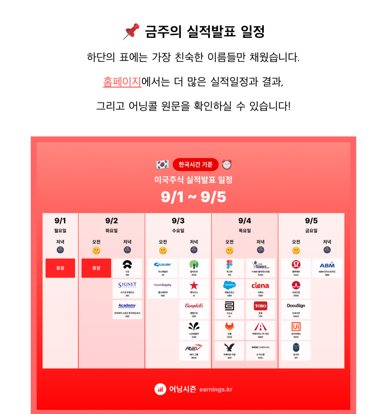 금주의 주요 기업 실적발표는 아래와 같으며 월요일인 오늘 밤은 노동절로 미국 증시는 휴징입니다. 목요일에 세일즈포스 및 피그마의 분기 실적 발표 예정입니다.