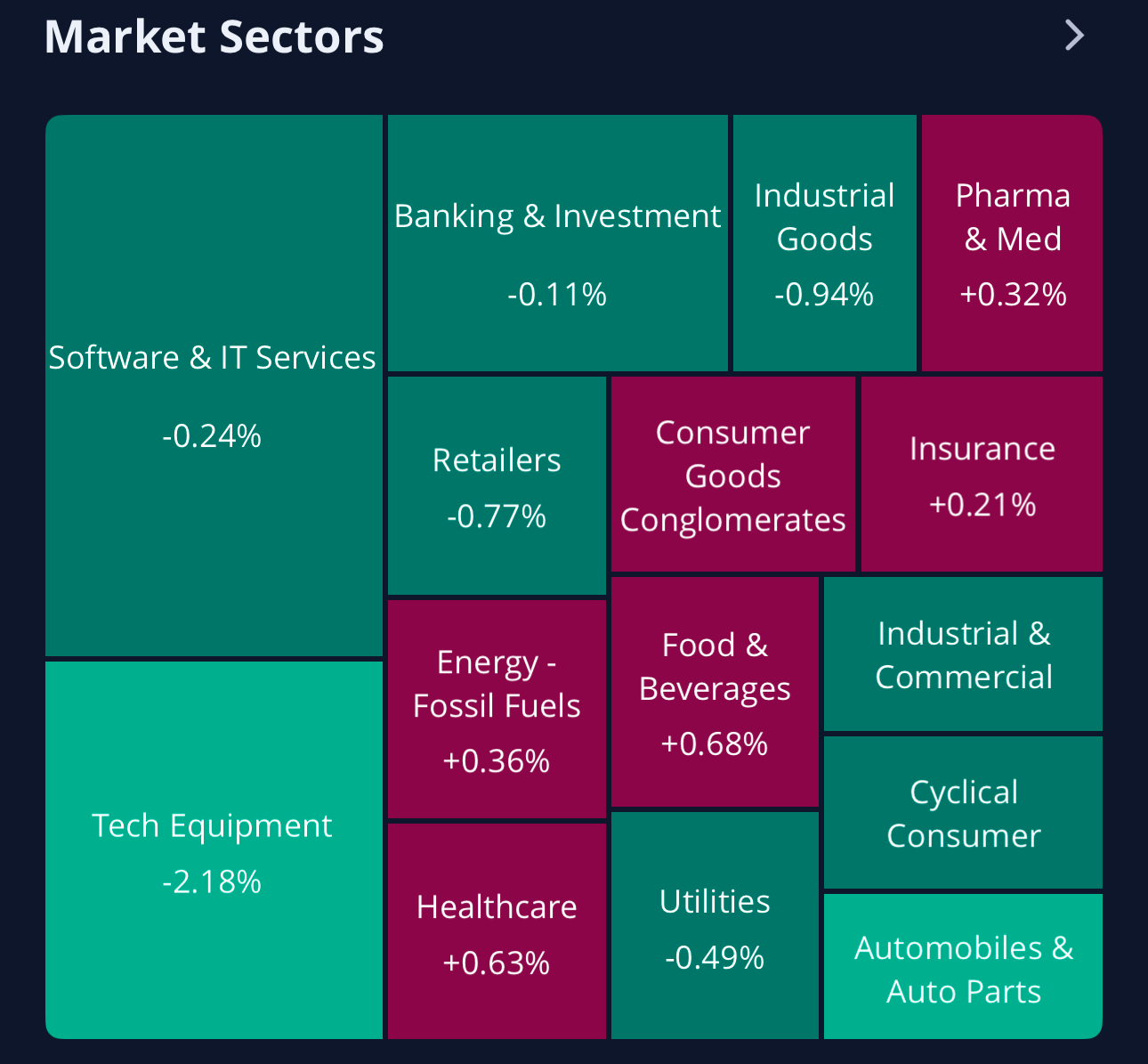 전체 섹터들중 상승 보다 하락한 섹터들이 더 많습니다.