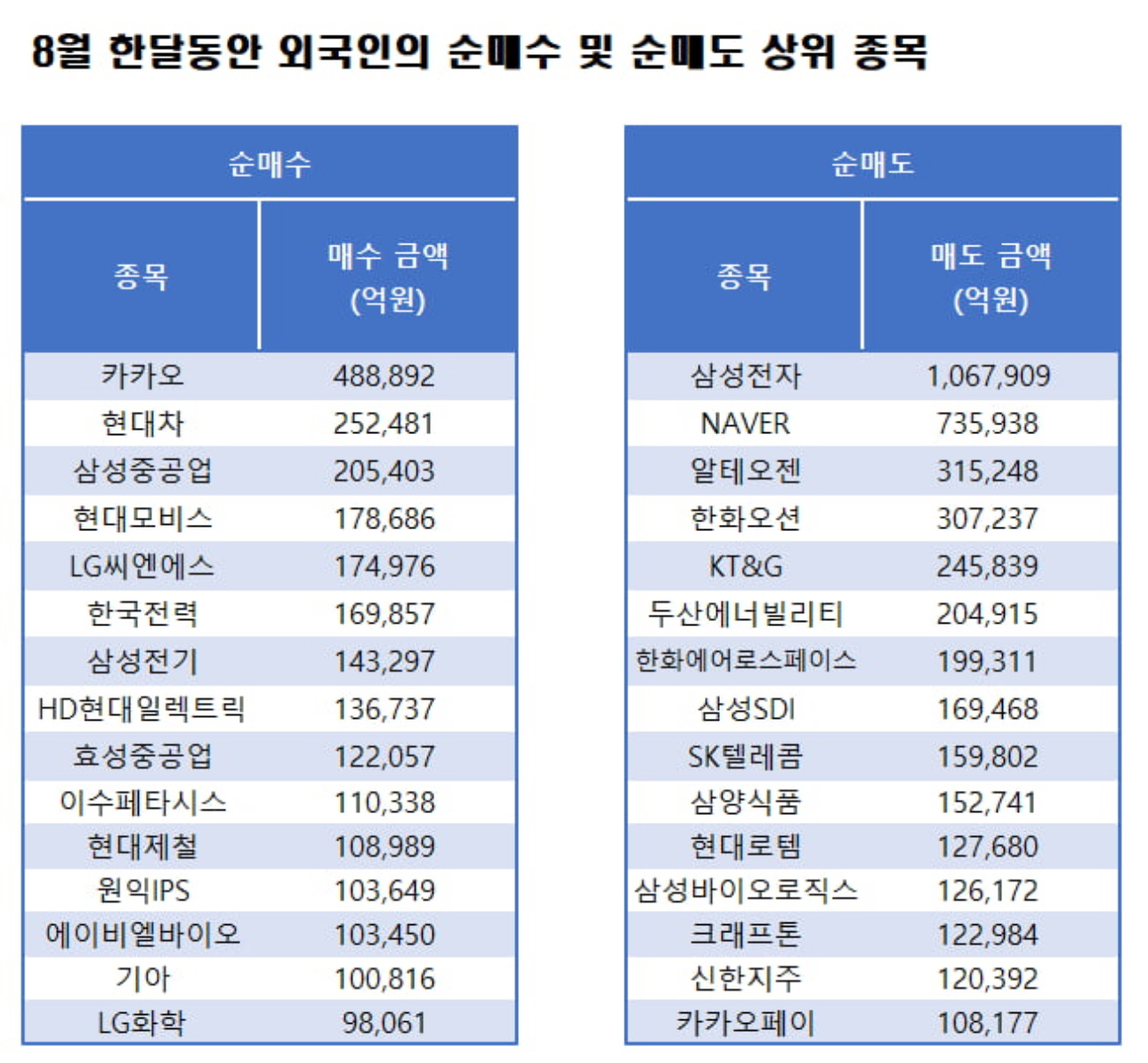 국내 증시의 외국인들이 5월부터 3개월간 순매수 기조에서 8월에는 한달간 순매도세로 1조 867억어치를 팔았습니다. 8월 한달간 순매수 매도 상위 종목은 아래와 같습니다. 자세한 내용은 위의 기사 링크를 참조하세요.