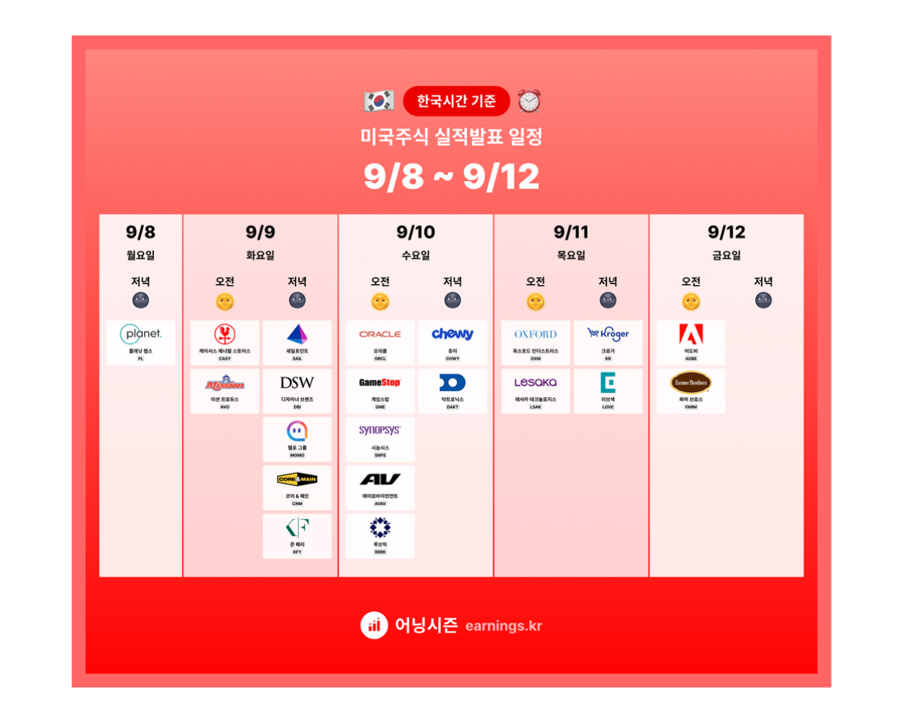 이번주 분기 실적 발표 예정 기업들은 아래와 같으며, 주요 기업은 수요일 오라클과 금요일 어도비가 예정입니다.