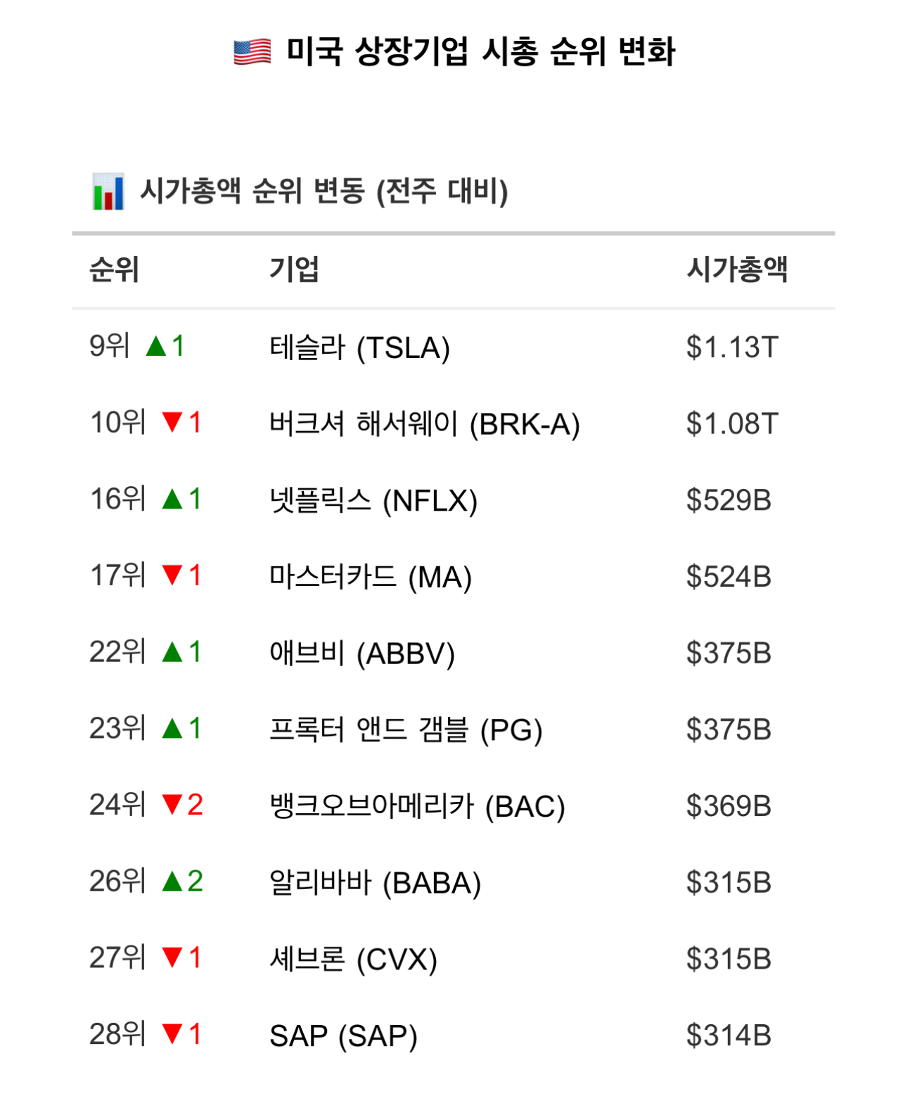 S&P 상장 기업의 지난주 시총 순위 변화는 아래와 같습니다. 아래 리스트에는 없지만 지난주 금요일 밤 브로드컴은 2분기 실적 발표 후 9% 급등입니다.