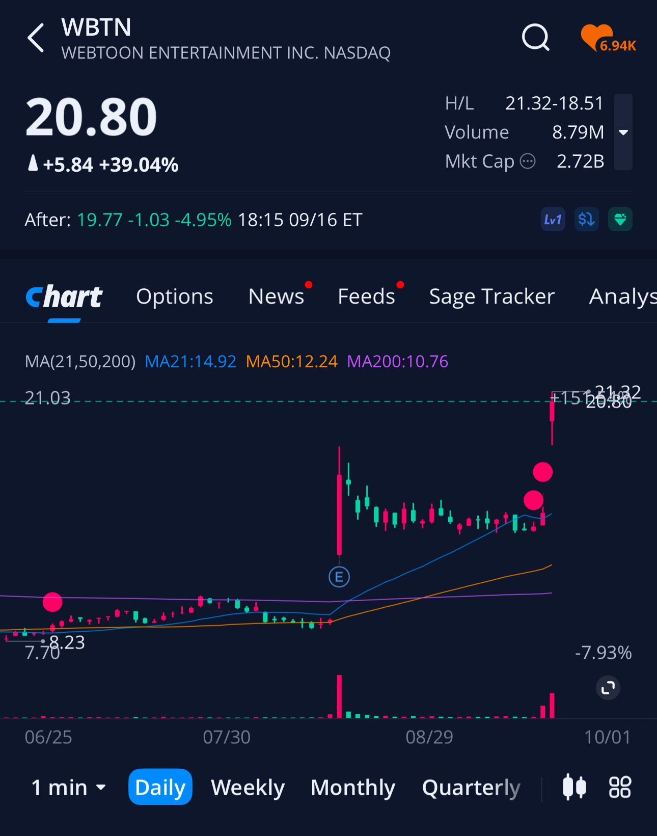 네이버웹툰이 어제 장마감후 발표된 디즈니의 네이버웹툰 지분 약 2% 인수협상 및 디즈니 디즈니의 마블과 스타워즈 브랜드를 위한 웹툰 플랫폼 구축 소식 기사로 39% 급등 했습니다. 10불 아래일때가 엊그제 같은데 어느새 2배나 상승 했습니다.