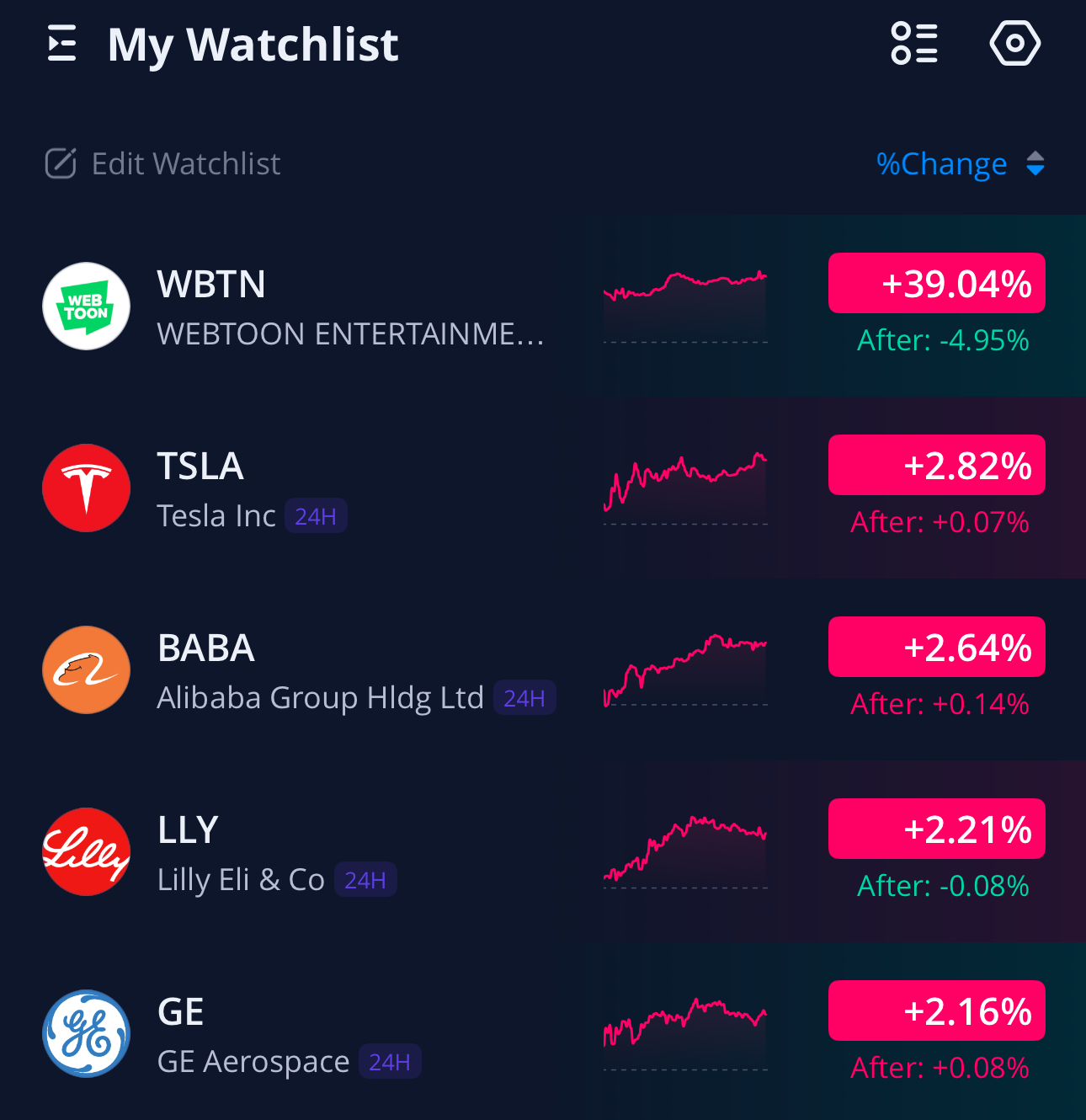 관심 종목들 중 일별 주가 상승률 Top5 는 아래와 같습니다.