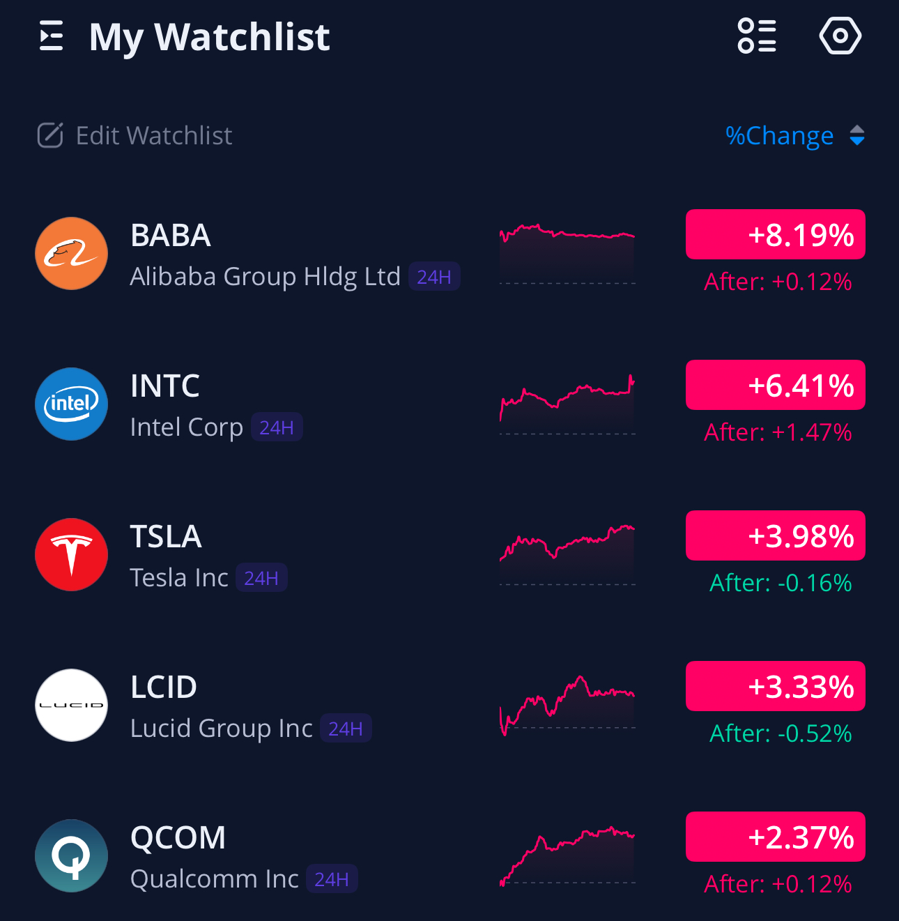관심 종목들 중 일별 주가 상승률 Top5 는 아래와 같습니다.반도체 회사가 2개, 전기차 회사가 2개 랭크인입니다.
