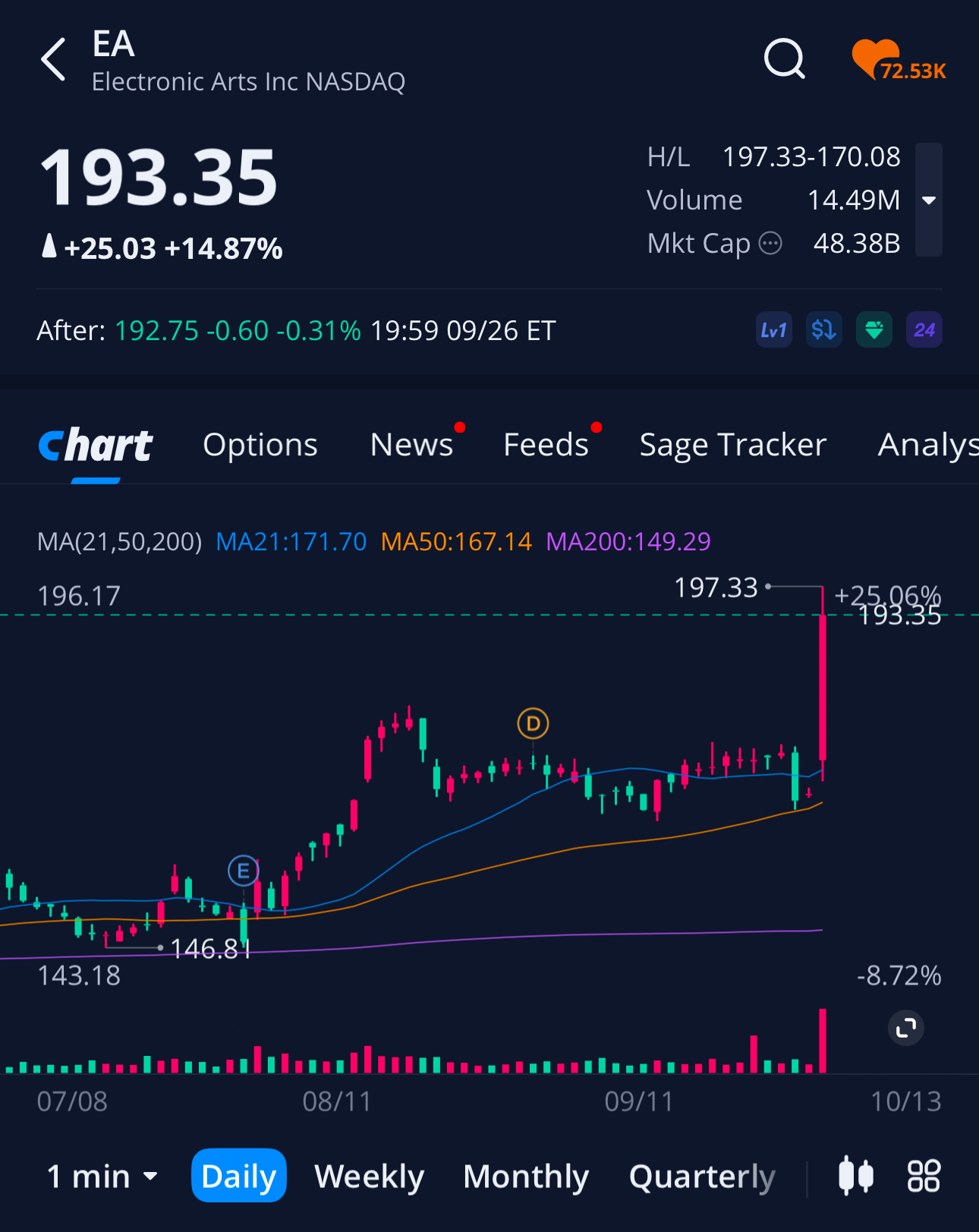 그래서 EA는 하루만에 14.8% 상승하여 역사적인 신고가 갱신 하여 193불이네요.
