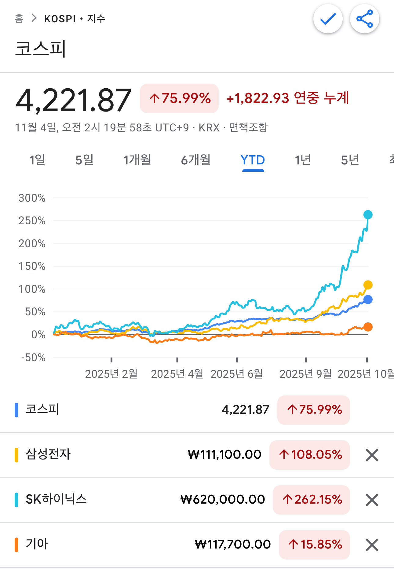 코스피가 4200을 돌파하면서 올해 초 기준 수익률이 75% 가 돌파 하면서 개미들의 보유 종목에 삼전 또는 닉스가 없는 개미들은 FOMO 감정을 느낄 것 같습니다. 특히나 저같은 경우 보유 종목들 중 기아는 올해 상승률이 15% 으로 코스피 수익률 보다 못한 상황입니다. 국장의 끝은 과연 어디까지인지 궁금하네요.