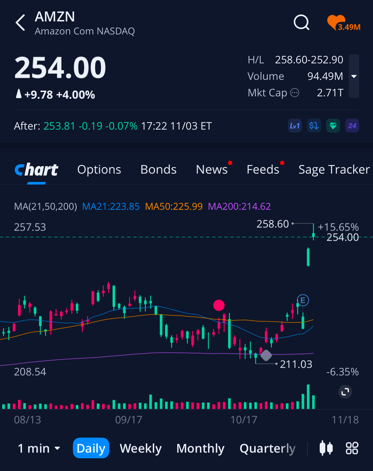 오늘의 특징주는 아마존입니다. 하루만에 4% 급등 했습니다. 실적 발표전 222불에서 실적 발표 후 점핑, 밤사이에 한번 더 점핑을 했습니다.